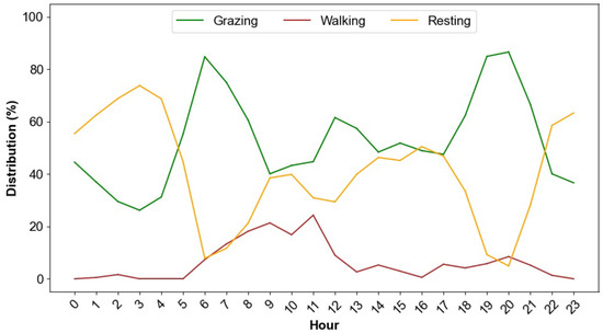 Diurnal distribution (hourly) of predicted behaviors of all the cows. The diurnal distribution reflects hourly averages of three behaviors (grazing, resting, and walking) for each cow across the entire tracking period (May 28 to 22 June 2018).