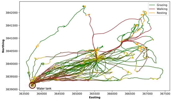 Global Positioning System (GPS) devices can remotely record spatial movements. Tracking data can be used to monitor livestock health and well-being as well as the use of forage across their pastures [11,15]. For example, GPS tracking successfully detected simulated water system failures [16]. Statistical packages and analyses have been applied to evaluate tracking data and automatically utilize collected data from GPS devices [17] and other sensors [14,18]. More recently, machine learning (ML) and data mining techniques [19] are gaining interest due to their power to extract useful knowledge from large datasets.