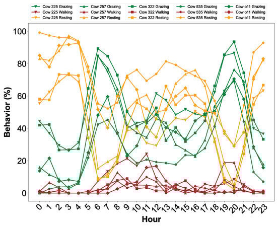 We studied five cows over 26 days, plotting their hourly activities. From 10 p.m. to 6 a.m., they rest more than grazing, with no walking. By 6 a.m., they wake, begin the grazing bout, and start walking. The peak walking time is around noon, possibly indicating movement toward water sources. A second grazing bout was predicted during 5 to 8 p.m. In the summer when our study occurred, cattle typically have two primary grazing bouts (early morning and evening [29,33]). Cattle may avoid grazing during midday and instead travel to water and rest to help compensate for high temperatures.