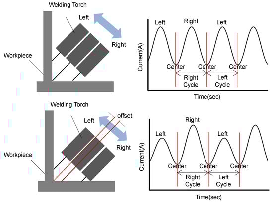 Algorithm 2 shows the process of performing seam tracking based on the outliers detected in each weaving area by the MBSC algorithm. Since the frequency of outliers is high in areas where the instability of the feedback current is relatively high, the position of the torch can be corrected and the weld seam can be accurately tracked by applying an offset in the opposite direction of the area. This approach enhances efficiency by enabling quick seam tracking even in conditions where the existing arc-sensing technique, which is based on the average current of each area, cannot effectively detect the torch’s bias due to the control of short-circuit transitions. In addition, if the frequency of outliers is similar in both areas, the existing arc-sensing technique, which performs seam tracking using the average feedback current, is applied to adjust the position of the torch more frequently. The difference in outlier frequency and the offset in MBSC-based seam tracking should be appropriately set according to the welding environment, and this approach improves the precision of seam tracking.
