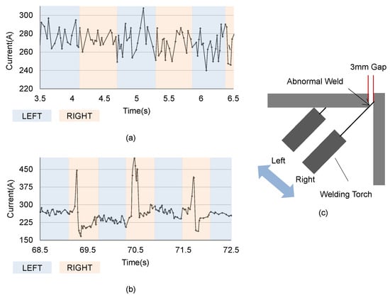 Figure 3 shows the weaving-area-specific feedback current values in conditions where there is a 3 mm gap in the target workpiece: (a) when the gap is located at the midpoint of the torch’s weaving, and (b) when seam tracking is delayed and the gap is located at the stay point of the weaving. In condition (a), it can be seen that the feedback current values are collected stably at a certain level. However, in (b), there is a sudden increase in feedback current values followed by a sudden decrease due to the transition to short-circuit control.