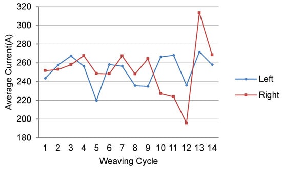 Figure 4 shows the weaving-area-specific average feedback current values measured in the same condition as above, displayed for each weaving cycle. Due to the curvature of the workpiece, the torch gradually gets closer to the left side of the workpiece. Therefore, as the weaving progresses, the average current value in the left area should increase, while the average value in the right area should decrease. However, the actual measured average value in the left area does not show much difference even as the weaving progresses and, instead, a sudden large decrease is observed in the fifth cycle, indicating unstable results. Afterwards, in the 11th, 12th, and 13th cycles, corresponding to the part in
