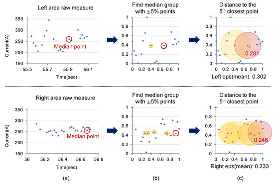 Since the proposed technique is based on DBSCAN, the values of and must be set according to the distribution and characteristics of the data to effectively detect the appropriate outliers. In a structured and stable welding environment, the range of current values is constant and the measurement cycle is stable, so the appropriate value can be determined through experimentation. However, in actual welding environments, the range and distribution of current values change dynamically due to the conditions of the workpiece and the changes in the distance between the torch and the workpiece, and time intervals between the collected current values are irregular due to unstable measurements. Therefore, in order to detect the appropriate outliers in actual welding environments, it is necessary to find an value that can quickly respond to dynamic conditions rather than using a fixed value.