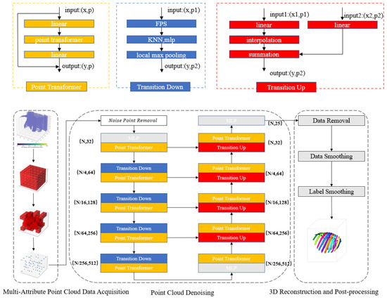 In recent years, 3D reconstruction from point clouds has received widespread attention in the fields of computer vision and computer graphics. These methods involve point cloud preprocessing, segmentation, and 3D reconstruction. The purpose of point cloud preprocessing is to generate a point cloud model or to generate high-quality point clouds for subsequent steps. Typically, this step includes four sub-steps: registration, noise filtering, outlier removal, and downsampling [26]. The purpose of point cloud segmentation is to segment the point cloud and obtain the points that satisfy the mathematical model of the object of interest. With the introduction of PointNet [27] and PointConv [28] into point cloud segmentation, the performance of point cloud segmentation has been further improved. 3D reconstruction from point clouds is different from mesh reconstruction [29], and its purpose is to generate a geometric model of the object of interest based on the point cloud segments obtained in the previous steps, effectively generating the object shape in the form of a dense point cloud. Current research has applied 3D point cloud reconstruction to medical imaging. Wu et al. [30] analyzed point clouds widely used in the medical field and improved the neighbor aggregation module in point cloud analysis networks to enhance their ability to extract complex biological structures. Wang et al. [31] proposed an effective method for facial reconstruction using depth sensors. For each test subject, multiple views of the 3D point cloud are acquired, and these point cloud sets are registered using the Iterative Closest Point (ICP) algorithm to reconstruct the 3D model. Although this method can achieve facial reconstruction, it lacks an effective point cloud denoising method, resulting in limited reconstruction accuracy and quality. Dixit et al. [32] used machine learning methods to extract features such as color, size, and depth from 2D X-ray images of the femur and used this information to create a mesh point cloud, then converted the image into an STL representation and created a 3D femur model using a CNN. This method obtained point cloud data with rich information and avoided information loss during the conversion process, but lacked effective post-processing methods, resulting in limited reconstruction accuracy. Stiles et al. [33] proposed a new deep learning-based framework that can automatically reconstruct the 3D left atrial surface directly from the point clouds obtained from the mapping systems commonly used in clinical practice. This CNN-based method has a lightweight design and can complete the reconstruction for each patient in about 10 s. Independent testing on two cross-modal clinical datasets showed that the method achieved a Dice coefficient of 93% and a Hausdorff distance of less than one pixel. This method can directly process 3D data with high spatial resolution and efficiency, but the process of acquiring point cloud data introduces noise and loss of detailed information, which reduces the accuracy of left atrial reconstruction. Banerjee et al. [34] proposed a fully automatic surface reconstruction pipeline that can reconstruct 3D cardiac anatomical meshes of multiple classes from raw cine MRI acquisitions. A key component is a multi-class point cloud completion network (PCCN) that can correct the sparsity and misalignment problems in 3D reconstruction tasks within a unified model. Compared to the benchmark 3D U-Net [35], this method reduced the reconstruction error by 32% and 24%, respectively. This method uses a PCCN to improve the reconstruction accuracy, but it increased the inference time, which was not conducive to clinical application. In addition, Yang et al. [36] first applied point clouds to the field of rib segmentation, converting voxels to point clouds and using the PointNet++ model to segment the rib point clouds from CT chest images, achieving accurate and stable rib point cloud segmentation. This method provides a knowledge base for the 3D reconstruction of rib point clouds and offers new ideas for this field, but is limited by the single point cloud denoising method and the limited feature extraction capability of the point cloud segmentation model, resulting in a bottleneck in rib segmentation accuracy, which is not conducive to obtaining high-quality 3D rib reconstruction results.
