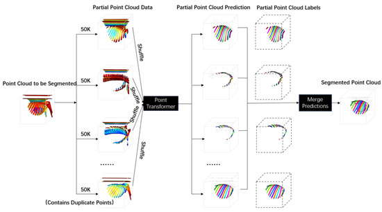 As shown in Figure 3, during the inference stage, a single test sample CT image was converted to point cloud data and processed with point cloud adaptive smoothing and denoising. Specifically, after removing noise points to obtain the point cloud data to be segmented, we sampled the point set in batches of 50 K points and shuffled the point sets to comply with the unordered principle of point clouds. The shuffled point sets were then fed into the PointTransformer loaded with the best weights to obtain the predicted rib point cloud. The predicted results of each point set were visualized using partial point cloud labels. Finally, all the partial point cloud predictions were merged to obtain the complete rib point cloud prediction. Multiple predictions were made using majority voting to improve prediction accuracy. After obtaining the complete point cloud prediction, 3D reconstruction and post-processing operations were performed to obtain the 3D reconstruction results of the ribs.