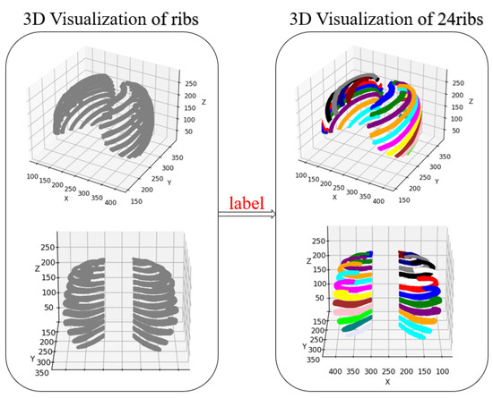 As shown in Figure 4, we obtained a mask file with 24 ribs labeled with different voxel values based on the above labeling method. We preprocessed these images, including HU value filtering, to generate point cloud data suitable for this experiment. As shown in Table 1, the dataset was divided into training, validation, and testing sets, with a reasonable distribution of 8:1:1 for the three sets to evaluate the performance of the model.