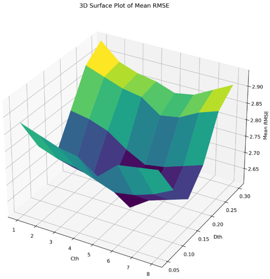 To verify the effectiveness of the point cloud adaptive smoothing and denoising method described in this paper, and to compare the effects of different parameters on point cloud adaptive smoothing and denoising, we used the pre-denoised point cloud data as the experimental object. By setting different point density thresholds and average distance thresholds, and setting a random seed during the use of the semantic segmentation model to ensure the invariance in its segmentation prediction, we finally obtained a denoised rib point cloud. To evaluate the denoising effect, we calculated the Mean Root Mean Square Error (Mean RMSE) between the denoised rib point cloud of all test samples and the standard rib point cloud. To obtain the optimal point density threshold and average distance threshold, this experiment tested the Mean RMSE under different combinations of point density thresholds (0.05, 0.10, 0.15, 0.20, 0.25, 0.30) and average distance thresholds (1, 2, 3, 4, 5, 6, 7, 8). The experimental data were used to plot the 3D surface graph shown in Figure 5, which helped us intuitively understand the trend of the denoising performance of the point cloud adaptive smoothing and denoising method under different parametric configurations. By observing this 3D surface graph, the trend of the influence on the Mean RMSE was an upward-opening parabolic trend, and the area with a relatively low Mean RMSE was around Tp = 0.15, which was helpful in finding the combination of Tp and Td that minimized the Mean RMSE, thereby optimizing the performance of the point cloud adaptive smoothing and denoising method and obtaining the best denoising effect. To more objectively evaluate the significance and reliability of the experimental results, as shown in Table 2, we compared the Mean Completeness Ratio (Mean CR) and Mean RMSE obtained under three different average distance thresholds (4, 5, 6) with the point density threshold set to 0.25, 0.15, and 0.05, respectively. The results show that when the point density threshold was 0.15, the overall Mean CR was higher than 0.25 and 0.05, and the Mean RMSE was generally lower than 0.25 and 0.05. Additionally, when the point density threshold was fixed, the best performance was obtained when the average distance threshold was set to 5.
