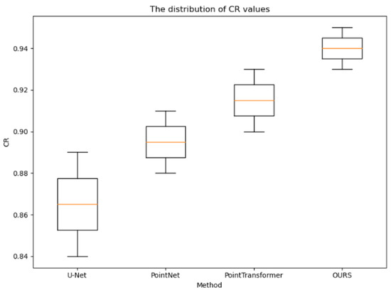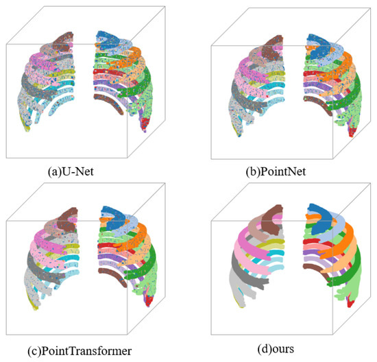 To verify the effectiveness of the post-processing method described in this paper, we conducted ablation experiments on the post-processing method. As shown in Table 4, in order to compare the effects of each stage of the post-processing method on the three-dimensional reconstruction and post-processing of the point cloud, we used the point cloud data before post-processing as the test object and obtained the post-processing point clouds at different stages. We calculated the mean square error between the rib point clouds obtained at each stage and the standard rib point clouds for all testing set samples and then evaluated the post-processing effect by taking the average mean square error. Without any post-processing, the quality of the obtained rib point clouds was relatively low, with many outliers, irregular regions, and misclassified points, resulting in a lower Completeness Ratio (CR) and higher Root Mean Square Error (RMSE). After outlier removal, a large number of outliers were eliminated, improving the quality of the rib point clouds, with the CR increasing by 1 percentage point and the RMSE decreasing by 12 percentage points. After point cloud data smoothing, the holes formed in the predicted rib regions were filled, resulting in a smoother rib region, with the CR increasing by 1 percentage point and the RMSE decreasing by 10 percentage points. Finally, after point cloud label smoothing, the numerous prediction errors in the smoothed rib point cloud were greatly improved, with the CR increasing by 1 percentage point and the RMSE decreasing by 11 percentage points. These results confirm the effectiveness of the proposed post-processing method in improving the quality, accuracy, and completeness of the reconstructed rib point clouds.