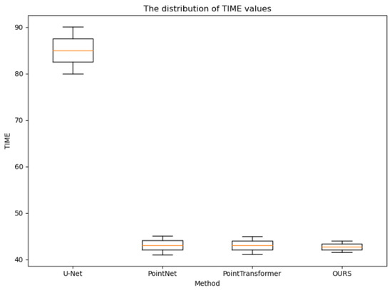 The distribution statistics of the cr, rmse, and time values obtained for the testing set CT images using the four methods, as shown in Figure 7, Figure 8 and Figure 9, further demonstrate the effectiveness of the proposed method. Compared to the other methods, the CR values obtained using the proposed method were consistently higher, the RMSE values were consistently lower, and the reconstruction time was on par with the other point cloud-based methods. Additionally, the variances in these three metrics were smaller for the proposed method, indicating more stable and consistent results, reducing the uncertainty in clinical applications. These observations provide strong evidence of the effectiveness of the proposed method and further verify its excellent performance in the task of 3D rib reconstruction. This offers valuable support for research and practical applications in this field and provides a useful reference for improving 3D rib reconstruction techniques.