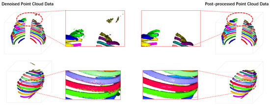 As shown in Figure 11, we visualized the post-processing effect on a test sample that had undergone point cloud adaptive smoothing and denoising. This sample had some misclassified points, which were either non-rib point clouds misclassified as rib point clouds, such as some colored point clouds above the left and right ribs, or a single rib point cloud predicted as another rib point cloud, such as some other colored point clouds on each rib. After the post-processing algorithm, the isolated misclassified points above the ribs were removed, and the predicted labels of the point cloud data on each rib were smoothed out, greatly enhancing the visualization effect of the ribs.