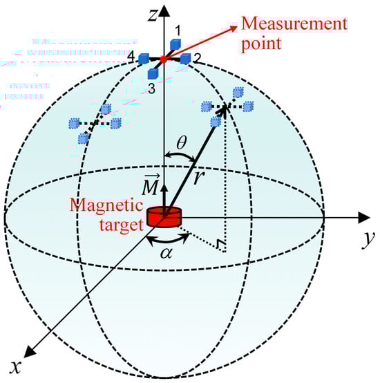 A Cartesian coordinate system is established with the magnetic target, having a magnetic moment vector of (0, 0, 10,000) A·m2 as the origin. For convenience, most simulation experiments on MAD are performed on a single measurement point or a straight-line measurement trajectory [2]. However, the results obtained this way are one-sided and unconvincing. To evaluate the measurement error of the measurement array comprehensively, the measurement points in this paper move around the magnet target, and the motion trajectory covers the whole spherical surface, as shown in Figure 3. The radius r of the spherical trajectory is 10 m. θ and α are the inclination and declination of the spherical coordinate system, respectively. The baseline distance of each MGT measurement structure is set to 0.34 m.