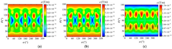 Firstly, according to the magnetic dipole model, the theoretical spatial distribution of the MGT field on the spherical measurement trajectory is obtained, which is regarded as the true value of the MGT. Then, Equation (1) is used to obtain the readings from each TAFM in the measurement array, and the finite difference approximation method is employed to calculate the final measured values of the MGT matrix at each measurement point. The evaluation index ε for the MGT measurement error is calculated using the following formula: