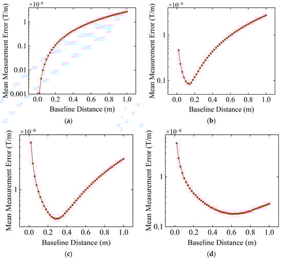 Variation in the average tensor measurement error with baseline distance under different sensor resolutions. (a) No sensor resolution constraints; (b) sensor resolution is 0.01 nT; (c) sensor resolution is 0.1 nT; (d) sensor resolution is 1 nT.