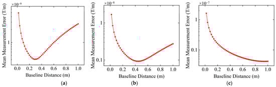 From Figure 6, we can find that after adding noise, the measurement error of the MGT measurement system also initially decreases and then increases as the baseline distance increases. When the baseline distance is small, noise and sensor resolution constraints have a greater impact on the measurement, and the real signal is almost drowned, thus resulting in a relatively large measurement error. As the baseline distance gradually increases, the influence of noise and sensor resolution constraints gradually decreases, and the measurement error also decreases. However, as the baseline distance continues to increase, the influence of high-order terms in the Taylor series becomes prominent, and measurement errors caused by high-order terms of the Taylor series gradually increase. Compared with the measurement error without noise influence in Figure 5c, the maximum measurement error at a noise level of 0.01 nT in Figure 6a increases by 2.80 × 10−10 T/m, and the minimum measurement error increases by 1.63 × 10−11 T/m when the baseline distance changes from 0.02 m to 1 m. When the noise level is 0.01 nT, 0.1 nT, and 1 nT, the corresponding optimal baseline distances are 0.28 m, 0.44 m, and 0.94 m, respectively. At these baseline distances, noise and sensor resolution constraints have less impact on the differential calculation, and the measurement error caused by higher-order terms of the Taylor series is also not obvious. Thus, the tensor measurement error reaches a minimum. Comparing Figure 6a–c, it can be seen that as the noise level increases, the optimal baseline distance of the MGT measurement system increases accordingly, which is consistent with the theoretical analysis results in Section 2.2, that is, the greater the noise, the larger the baseline distance needs to be set.