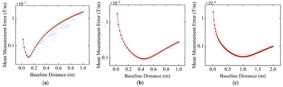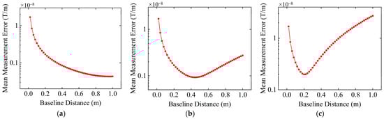 According to the theoretical analysis in Section 2.2, when there are no sensor resolution constraints and noise, only the higher-order terms of the Taylor series affect the accuracy of tensor measurement. Therefore, theoretically, the measurement error will continue to increase with an increase in baseline distance. As seen in Figure 5a, the simulation results are consistent with the theoretical analysis, further validating the correctness of the theoretical analysis. Hence, under ideal conditions without noise influence and sensor resolution constraints, to achieve more accurate tensor measurements, the baseline distance should be kept as small as possible.