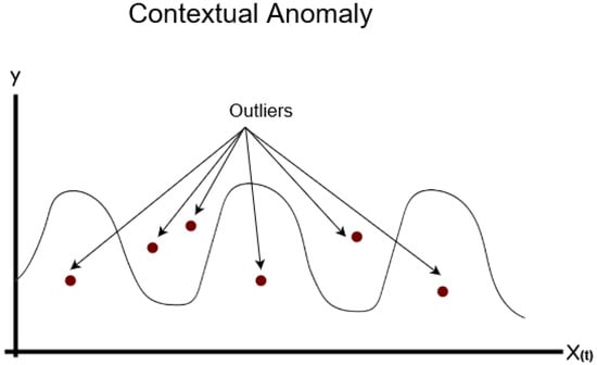 Contextual anomalies are those instances that are deemed abnormal within a specific context. A point is examined in several settings in order to ascertain whether or not it is abnormal. For instance, the context is nearly always temporal in the case of time-series data, which are recordings of a certain amount across time. Contextual outliers, on the other hand, are data points that significantly deviate from other data within the same context. Anomalous observations in a time series are those that deviate considerably from the observed pattern and do not follow the pattern in the time-series data. Figure 4 shows an example for contextual anomalies.