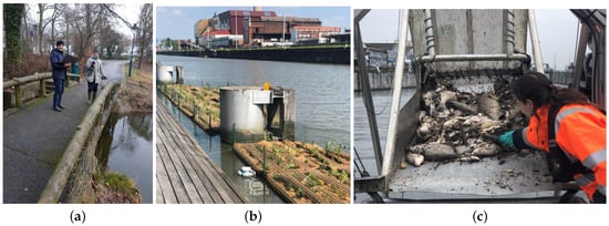 Collecting samples from the leybeek ettang (a). Brussels canal (b). Death fish found on the canal (c).