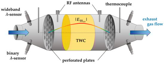 The analysis is partly based on data previously published in [28,35], which has been processed in a different manner for this study. In addition, new results are shown using the same measurement setup. The configuration shown in Figure 1 is therefore only briefly described here. Further details can be found in [35]. The state diagnosis setup for the three-way catalyst consists of the housing, the coupling elements, which are often labeled as antennas, and the sensor systems for exhaust gas analysis in the cones up- and downstream of the catalytic converter. For the latter, a binary lambda probe (LSF 4.2, BOSCH, Gerlingen, Germany), a wideband lambda probe (LSF 4.9, BOSCH, Gerlingen, Germany), and a thermocouple (TC) are used in each case. The TC tips are located in the center of the canning cross section and the exhaust temperature is calculated from the arithmetic mean of both sensors. In addition, the gas concentrations downstream of the catalyst are measured by a FTIR gas analyzer (Multigas 2030, MKS Instruments, Andover, MA, USA).