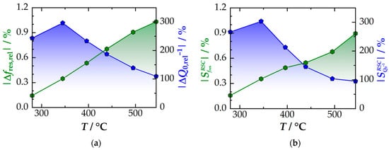 Instead, the inverse quality factor shows a completely different picture (Figure 9b). The temperature cross effects at 300 °C are even lower than at 500 °C (≈ half the size—relative to RSC amplitude of Q0−1), which in the end originates from the high sensitivity of the Q0−1 signal and the rapidly activated SP hopping in CZO. Overall, the quality factor clearly represents the more reliable signal for RF-based state diagnosis at low temperatures.