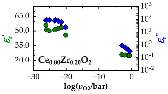 The varying different orders of magnitude observed for the resonant signals can be explained by defect chemical effects. Beneficial information on this topic is provided by another study, which investigated the correlation between the defect chemistry of CZO and its dielectric properties in the microwave range [28]. Figure 3 displays excerpted results on the relative permittivity (green) and dielectric losses (blue) in the Ce0.80Zr0.20O2 powder sample. Such CZO compositions are representative of the oxygen storage material found in three-way catalysts [14] (even slightly different compositions do not significantly affect the fundamental conclusions that can be drawn from the results). The analysis shows that oxidized CZO (high oxygen partial pressures pO2) has a dielectric permittivity of approximately 25, which is approximately doubled by the chemical reduction at low pO2. As explained in the previous section, changes in the dielectric permittivity primarily affect the resonant frequency and are based on the excitations of additional and existing phonon modes in the lattice [28,34]. In comparison, the dielectric loss in CZO increases significantly more during the reduction with more than two decades (note the logarithmic scale for in Figure 3). This effect correlates with the activation of the SP hopping mechanism and therefore with the concentration of oxygen vacancies [27,33,45]. In the microwave measurement, the dielectric loss is in turn linked to the inverse quality factor. Thus, the different magnitudes of the signal amplitudes of fres and Q0−1 can be explained physically.
