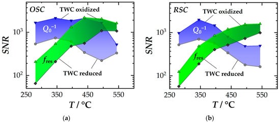 The temperature-dependent SNR curves of fres (green) and Q0−1 (blue) are shown in Figure 4a,b. Figure 4a contains the processed data from [35] for the RSC balance and Figure 4b for the OSC balance. As the data show, each resonant signal has an upper and a lower limit. The upper limit refers to the fully oxidized catalyst. Here, the quality factors are highest in the cavity resonator due to the small dielectric losses. The lower limit thus marks the completely reduced catalytic converter where quality factors are much lower. As another result, the standard deviations of both resonant signals generally increase with temperature and therefore have a negative impact on the SNR. In operation, the SNR lies between these two limits (the fully oxidized and reduced states should generally be avoided due to emission breakthroughs).