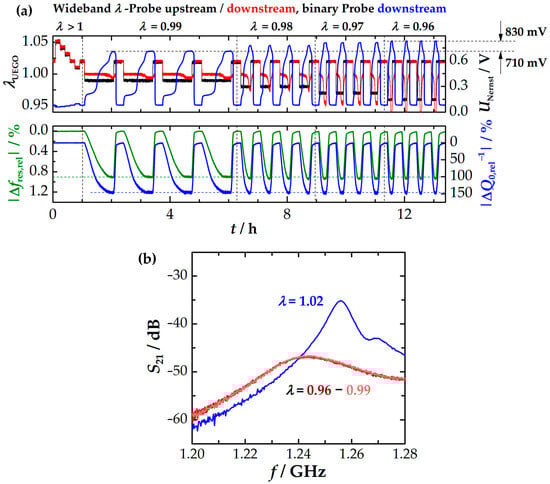 During the second part of the experiment (t > 1 h), substoichiometric exhaust gas compositions were applied to the TWC ranging from 0.96 to 0.99. Re-oxidation occurred at λ = 1.02. Four cycles were run for each setting. The individual sections of the experiment are indicated by dashed vertical lines. The Nernst voltage of the downstream binary probe (blue) increased during the rich phase, indicating a decrease in pO2 with lower lambda values. The change in pO2 can be quantified by the rise in Nernst voltage from 710 to 830 mV (with a typical sensitivity of approximately 50 mV per pO2 decade for low pO2) to over two orders of magnitude. Here, the quality factor (blue) consistently shows a stable and constant value for the fully reduced oxygen storage (see Figure 5a, bottom plot). In contrast, the resonant frequency exhibits a slight shift towards lower values with higher oxygen deficits. In the range of 0.96 ≤ λ ≤ 0.99, the total change is less than 0.4 MHz. In contrast, the signal amplitude of fres on the oxygen storage level of the catalyst (at 500 °C) is approximately 30 times greater (>11 MHz). Therefore, the relative deviation is ca. 3%, indicating that oxygen stoichiometry remains the primary impact factor of both RF signals. Indeed, the spectra under rich exhaust gas conditions are nearly identical, as shown in Figure 5b. However, it is worth noting that the quality factor is more resistant to changes in exhaust gas stoichiometry. Considering the CZO defect chemistry, this result appears plausible. As previous measurements have shown (e.g., see in Figure 3), the dielectric losses in CZO increase by several orders of magnitude during reduction (high → low pO2), but do not change significantly at low pO2 anymore. This effect is primarily due to the inhibition of the SP hopping mechanism at high Ce3+ concentrations [31,59]. For further elaboration, we refer to the microwave study of CZO in [28]. In contrast, the lower changes in polarization (maximum factor 2) could generally explain the higher interference effects on the resonant frequency.