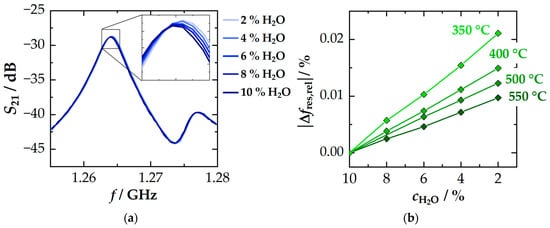 Effect of the H2O concentration on the RF signal: (a) transmission spectrum (S21) near the TE111 mode at 350 °C and (b) temperature-dependent effect on the relative change in resonant frequency Δfres,rel.