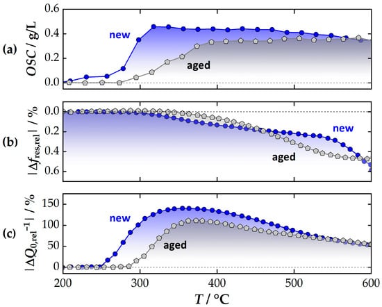 In the previous study, the influence of catalyst aging on the RF signals was also investigated using smaller catalyst cores (Setup B) [35]. For this purpose, fresh and aged TWCs of the same type were investigated. Hydrothermal aging was performed at 890 °C for 150 h. For the investigation, the resonant signals of both TWCs were recorded during heating to 600 °C at approx. 3 K/min. In parallel, rich and lean atmospheres were alternated to determine the RF response to the oxygen storage level. The exact conditions are described in [35]. In order to further investigate the differences between fres and Q0−1, the temperature-dependent OSC of the catalyst was determined, and the associated (relative) signal amplitudes of the resonant Δfres,rel and ΔQ0,rel−1 were determined, referencing again the fully oxidized catalyst. The results are shown in Figure 7.