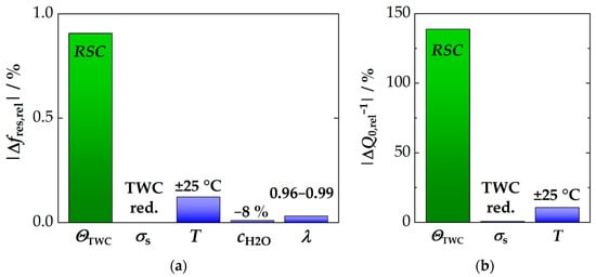 As a final section of this study, the various influences on the RF system are now compared with the reaction to the oxygen storage to clarify and understand which factors are most important for operation. Such a comparison at 500 °C is shown in Figure 8, where Figure 8a shows the data for fres and Figure 8b for Q0−1. The RF signal amplitudes to the full RSC of the TWC are shown in green in both figures. All secondary influences and interferences are then shown in blue. Firstly, each RF signal is compared to its standard deviation σs in case of a fully reduced TWC, as this is the worst-case scenario (for details, see Section 3.1). In addition, the impact of deviations in the estimated/predicted catalyst temperature (±25 °C) is shown (data adapted from [35]). Based on experiments in this study, the effect of an 8% change in water concentration is also demonstrated. More precisely, only the reduction of cH2O from 10 to 2% was investigated. However, as shown in Figure 6b, the effect is approximately linear. Thus, certain generalizations can be made for typical operation conditions. Last, the influence of the exhaust stoichiometry under rich conditions is also included (range of 0.96 ≤ λ ≤ 0.99).