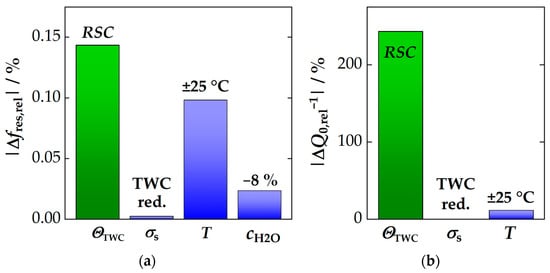 Comparison of various influences on the RF signals at 300 °C for (a) the resonant frequency and (b) the inverse quality factor: The signals to the full oxygen storage capacity (RSC, green) are compared with their standard deviations σs (of the fully reduced TWC) and with the effect of a temperature deviation of ±25 °C and the change in H2O concentration of 8%. The latter was derived by extrapolation of the data in Figure 6b.