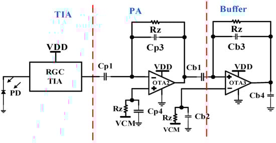 The AFE illustrated in Figure 2 comprises three distinct stages. Firstly, the proposed capacitive feedback common drain feedback transimpedance amplifier (CF-CDF-TIA) serves as the initial stage. Following this is the second stage, which incorporates capacitive feedback post-amplifier (PA) to further amplify the signal. Within this module, the post-amplifier is realized using an operational transconductance amplifier (OTA) with capacitive feedback. Lastly, the final stage of this PPG optical receiver consists of an output buffer tasked with driving the capacitive input in the subsequent stage.