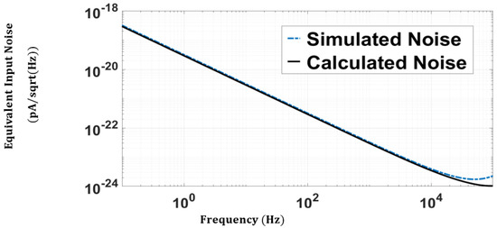 Figure 5 compares the simulated and calculated input noise current for the CF-CDF-TIA. Figure 5 shows how closely the derived theoretical noise model fits with the simulated one. The calculated integrated noise current is equal to 6.93 × A, and the simulated total input-referred noise current is 7.362 × A.