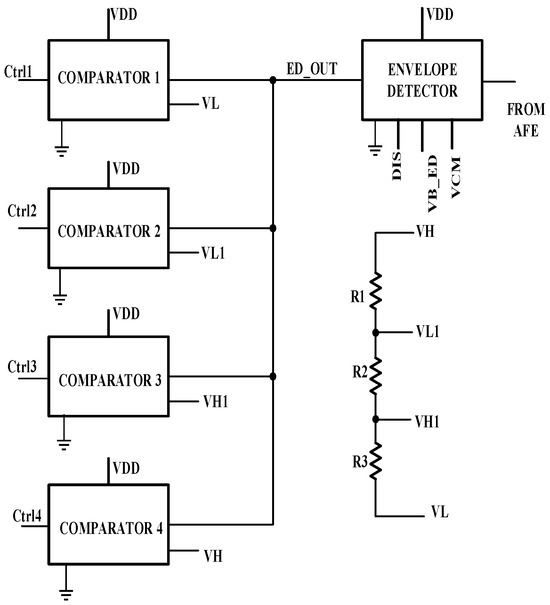 Figure 6 shows the ALC module designed in this paper. It consists of an envelope detector and four comparators. The output of the amplifiers’ chain is provided as an input to the peak detector. The output of the peak detector is fed to four different comparators, which work at four different voltage levels between the maximum and minimum voltage levels detected at the output of the amplifier’s module. The ALC generates four different control signals (Ctrl1, Ctrl2, Ctrl3, Ctrl4), which control the LED driver’s current level. If the envelope detector output is below the threshold voltage of VDD/2 V, the amplitude is considered to be low, and the LED current is increased to the next level.