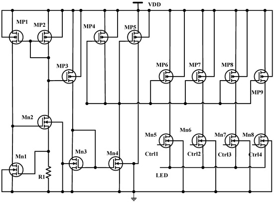 If the envelope detector values are above VDD/2 + 0.2 V, the signal amplitude is considered to be high; hence, the LED current is reduced by one step. The LED driver supplies the LED with the required current to emit enough optical power to have a high-quality PPG signal. Figure 7 below is the LED driver designed to have four channels. The four LED channel current levels are controlled through switching transistors using Ctrl1, Ctrl2, Ctrl3, and Ctrl4 from the ALC. The left side of the driver includes and and R1 provides the reference current, which is mirrored using and for the four channels Different mirroring ratios 2:4:8:16 are used to supply various LED current ranges from 400 μA to 11 mA for each channel. Table 4 below shows the LED driver’s MOSFET design parameters. The value of resistor R1 in the LED driver is 15 kΩ.