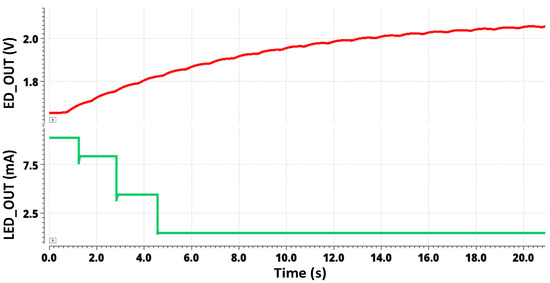 Figure 8 shows the transient simulation for a high-input photocurrent of 20 µA. The envelope detector output and the LED driver output for 20 µA are showcased in this figure. The output of the AFE contains both AC and DC components of the PPG signal. The envelope detector demodulates the signal, capturing the peaks and troughs of the pulsatile AC component, which represents varying blood volume. Initially, the signal is rectified by taking the absolute value of the AC component, making all parts of the waveform positive. This rectified signal is then passed through a low-pass filter, smoothing out rapid fluctuations and leaving a smooth envelope that corresponds to the peaks of the original signal. Figure 8 also indicates that the switching mechanism of the LED driver mentioned above reduces the LED current at high input photocurrent levels. Figure 8 indicates that different mirroring ratios 2:4:8:16 are used to supply various LED current ranges from 400 μA to 11 mA for each channel. The LED driver consumes a maximum power of 1.515 mW.