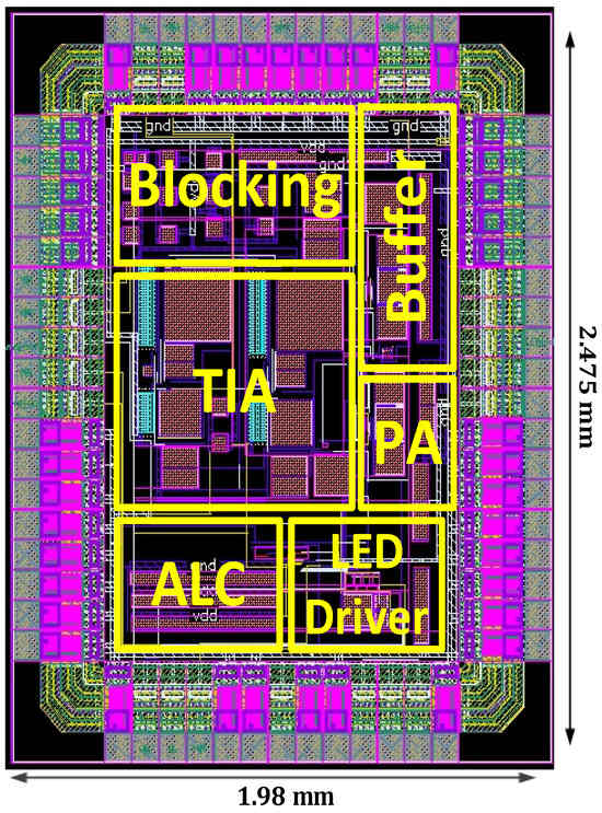 - Atef, M.; Zimmermann, H. 10 Gbit/s 2 mW inductorless transimpedance amplifier. In Proceedings of the IEEE International Symposium on Circuits and Systems (ISCAS), Seoul, Republic of Korea, 20–23 May 2012; pp. 1728–1731. [Google Scholar]