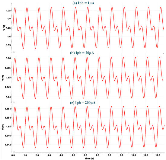 The complete system layout and the system simulations are implemented using AMS at 0.35 µm with CMOS Cadence Virtuoso technology. Figure 9 depicts the layout of the sensor module with a chip area of 1.98 mm × 2.475 mm. The post-layout frequency response simulation for different photocurrents from 1 nA to 200 µA is depicted in Figure 10. As the input photocurrent increases, the gain decreases. The output is amplified by 145.3 dB at a low input photocurrent while maintaining linearity at a high input photocurrent of 200 µA by reducing the gain to 98.73 dB. This gain reduction preserves the signal linearity at a high-input photocurrent. The overall bandwidth for the proposed system is 1.6 kHz for a low-input photocurrent. The overall bandwidth is limited by the post-amplifier and output buffer bandwidths, though not by the TIA bandwidth. Figure 11 illustrates the post-layout transient simulation for the PPG sensor module, highlighting that the ALC module ensures the output signal remains within the linear range despite wide variations in received optical power. This prevents distortion from signal overload or the excessive amplification of weak inputs. As shown in Figure 11, the PPG sensor system maintains its shape even with a high input photocurrent of 200 µA. The transient analysis used input photocurrents of 1 µA, 20 µA, and 200 µA. Moreover, the perfusion index of all three outputs of the PPG sensory system is shown in Figure 11 for different input currents of 1 µA, 20 µA, and 200 µA is 1 %. Figure 12 further elaborates on this point by showing the total harmonic distortion (THD) for input photocurrents ranging from 1 nA to 200 µA, demonstrating that the THD remains very low, in the range of a few milli, even at 200 µA. A THD in this range signifies that the PPG sensor system has high signal linearity, meaning that the output signal closely replicates the input signal with minimal harmonic distortion. A low THD indicates that the system introduces very little noise and few artifacts into the signal, which is critical for medical devices where noise can obscure essential physiological information or lead to incorrect readings. With minimal harmonic distortion, the PPG system can detect subtle changes in physiological signals, enhancing the device’s sensitivity and responsiveness. This is especially beneficial for monitoring conditions that require detecting minor variations over time.