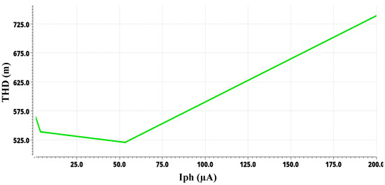 Simulation showing the total harmonic distortion for input photocurrent from 1 nA to 200 µA.