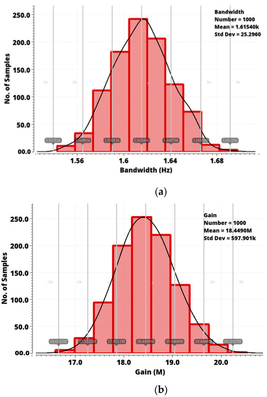The effect of process variation on the proposed PPG sensor bandwidth and gain was analyzed using Monte–Carlo simulation. The bandwidth and gain changes were calculated for 1000 Monte–Carlo runs and are plotted in Figure 13a,b.