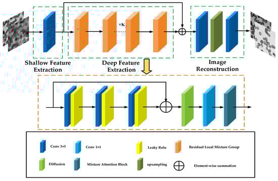 As demonstrated in Figure 1, inside the deep feature extraction block, the input is first directed into a convolution module comprising a 3 × 3 convolution and a LeakyReLU activation function. The convolution module can enhance the model’s feature representation capabilities through the mechanisms of convolution and activation functions. Afterwards, the model inputs the information into the Gaussian diffusion model, simulating the image diffusion process in the Fourier space to handle noise and artifacts in the image. Following a 1 × 1 convolution to reduce channel dimensions, the information is then fed into the hybrid attention module to further enhance the quality of the reconstructed images.