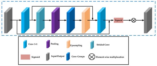 As demonstrated in Figure 3, the spatial attention technique first leverages a 1 × 1 convolutional layer to lower the channel dimension. Then, to expand the receptive field, a combination of stridden convolution (stride 2) and max pooling layers are leveraged to swiftly downscale the spatial dimensions of the network. To restore the spatial size, an upsampling layer is added, and a 1 × 1 convolutional layer is leveraged to reinstate the channel count. Finally, a sigmoid layer is used to generate the attention mask. Furthermore, skip connections are introduced, enabling the direct transfer of high-resolution features preceding the spatial dimension reduction to the output of the block. This design not only optimizes the efficiency and effectiveness of the network but also achieves effective processing of information at different scales through fine-grained structural adjustments, thereby improving the overall performance.