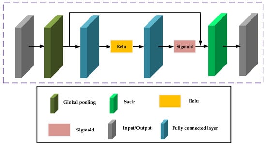 As demonstrated in Figure 4, the structure of the SE layer evaluates the importance of the distinct channels comprising the feature map and adjusts the channel weights based on these evaluations. The SE layer consists of two key operations: squeeze and excitation. First, the input information is passed through global average pooling to transform the feature map of each channel into a single real-valued quantity, reflecting the comprehensive information of that channel. This process captures the global receptive field of each channel, enabling the learning of dependencies between channels. Subsequently, a fully connected network (that comprises two dense layers and an activation function, with the first dense layer reducing the dimensions and the second restoring the original channel count) processes the real number sequence obtained from the squeeze operation. The fully connected network learns the importance of each channel and outputs a weight vector corresponding to the number of input channels. Finally, the SE layer multiplies the weight vector obtained from the excitation operation with the original feature map on a per-channel basis, thus adjusting the weights of the distinct channel features. The SE layer helps the network focus better on important feature channels and suppress less important ones, thereby improving the network’s performance.