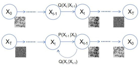 The diffusion model evolves from an initial state to a target distribution through a series of iterative processes. It can be seen as a random walk in probability space to simulate the target distribution. The diffusion model is significant in image-generation tasks. Leveraging its ability to learn the probability distribution of images can produce images that are of high quality and exhibit a high degree of realism. The diffusion model comprises two processes: “noising” and “denoising.” As shown in Figure 5, during the noising process, input X0 constantly mixes with Gaussian noise. After T iterations of noising, the image XT becomes a pure noise image following a standard normal distribution. During the denoising process, the network learns T denoising steps to restore XT to X0.