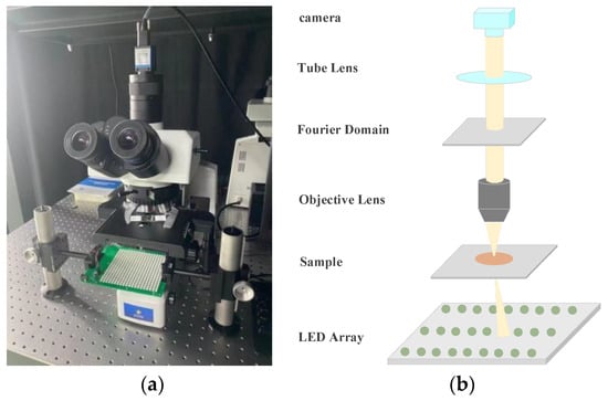 This experiment employs a simulated dataset encompassing 15,000 sets of high-resolution image data. Every set is composed of two images, one representing the intensity channel and the other the phase channel. The synthesized complex amplitude data from the two input channels are simulated using the Fourier imaging system. As part of the simulation process, Gaussian noise with a mean of 0 and a standard deviation of 3 × 10−4 is incorporated to emulate potential system error noise encountered in real-world imaging scenarios. These Gaussian noise-added data are regarded as low-resolution data pertinent to Fourier ptychographic imaging. A conventional Fourier ptychographic reconstruction algorithm, executed with a solitary iteration, is subsequently applied to combine these low-resolution data into low-resolution complex amplitudes. This produced 15,000 sets of low-resolution input data. Ultimately, the 15,000 sets of high-resolution image data were reserved to be used as the reference images for subsequent performance evaluation and comparative analysis. The architectural design of the Fourier ptychographic microscopy system is depicted in Figure 6.