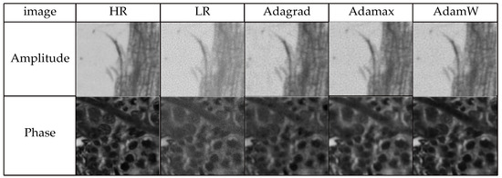 To achieve better optimization results for the experiment while keeping the loss function and number of iterations the same, Adagrad, Adamax, and AdamW optimizers were chosen for comparison, respectively. The comparison of loss curves for different optimizers is shown in Figure 7. The number of iterations is shown on the horizontal axis, and the loss value for each training session is plotted on the vertical axis of this figure. The three curves represent the three different optimizers. From the figure, it is evident that the model trained using the AdamW optimizer demonstrates quicker loss decrease and superior convergence relative to the other two optimizers. The reconstruction findings are presented in Figure 8, where HR represents the original high-resolution image, and LR corresponds to its corresponding low-resolution image. It is discernible that the intensity images reconstructed by all three optimizers achieve good results, but the network trained with the AdamW optimizer produces the highest-quality phase images, followed by Adamax, with Adagrad yielding the lowest quality. Tabulated in Table 1 are the quantitative metrics, SSIM, and PSNR, for the reconstruction images generated by the three optimizers. As can be observed from the table, the AdamW optimizer significantly outperforms the other two optimizers in image quality. For intensity images, the PSNR of the AdamW reconstruction results is higher than the other two optimizers by 0.96 and 6.91, respectively. For phase images, the SSIM of the AdamW reconstruction results is higher than the other two optimizers by 0.0676 and 0.43, respectively. This comparative experiment serves to substantiate the effectiveness of the AdamW optimizer network.