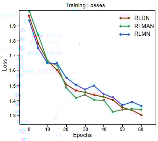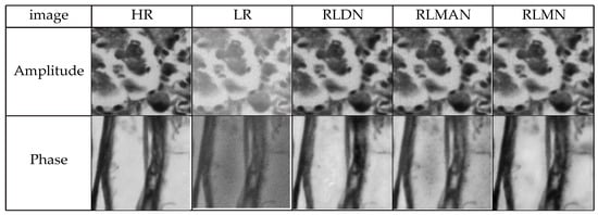 In this section, we conducted ablation experiments to validate the effectiveness of the Fourier ptychographic reconstruction method combining hybrid attention and Gaussian diffusion models. Among them, RLDN is the network with the standalone addition of the Gaussian diffusion model, RLMAN is the network with the standalone addition of the hybrid attention mechanism, RLMN is the residual local mixture network. Keeping the loss, learning rate, and noise parameters uniform, the network is trained using the three models. As presented in Figure 9, three model networks achieve good convergence performance, but the loss value for the mixture network remains stable throughout the descent in contrast to the other two networks. The reconstruction results generated by the three models are depicted in Figure 10. It is clear that all three models achieve good reconstruction results, but the RLMN model produces the reconstructions of the quality that are closest in resemblance to the ground truth. Table 2 presents the quantitative results of the reconstructed images’ metrics of SSIM and PSNR. The information presented in the table reveals the RLMN model’s superior performance over the other two models in both intensity and phase image metrics, demonstrating the effectiveness of the RLMN model.