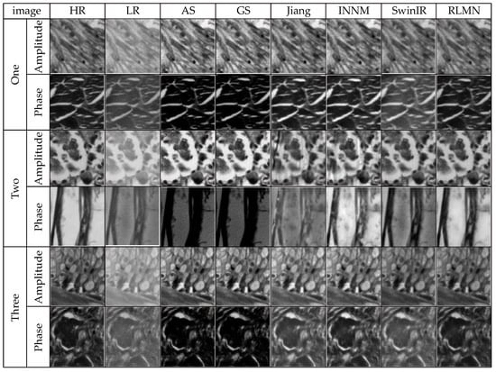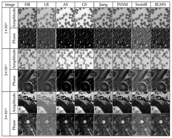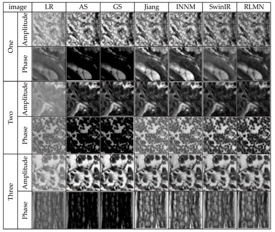 In the context of FPM image acquisition, the image quality can be compromised by a range of variables, like instrumentation and illumination, resulting in noise. To simulate these real-world conditions, this section employs Gaussian noise with a mean of 0 and a standard deviation of 3 × 10−4 as the primary interference condition to additionally validate the efficacy of the presented approach. The traditional phase recovery methods A-S [] and G-S [], the neural network-based reconstruction method proposed by Jiang et al. [], the INNM method proposed by Zhang et al. [], and the SwinIR method proposed by Wang et al. [] were used as comparative algorithms against our proposed reconstruction method in this study. A trio of image sets are randomly picked from the test collection. The reconstruction outcomes of disparate approaches under identical noise conditions are illustrated in Figure 11. Table 3 presents the quantitative performance of the distinct reconstruction approaches using SSIM and PSNR evaluation. The results shown in Figure 11 and Table 3 indicate that the reconstruction approach presented in this article demonstrates a better reconstruction effect and performance metrics. The reconstructed images have higher clarity compared to the phase reconstruction results of the G-S, A-S, and Wang et al. methods. Relative to the methods of Jiang et al. and Zhang et al., the reconstruction results in this work do not exhibit significant artifacts, and they contain more textural details while reducing errors. The bolded values in Table 3 indicate the optimal results. In terms of the reconstruction metric values, the method in this chapter outperforms the other five approaches.