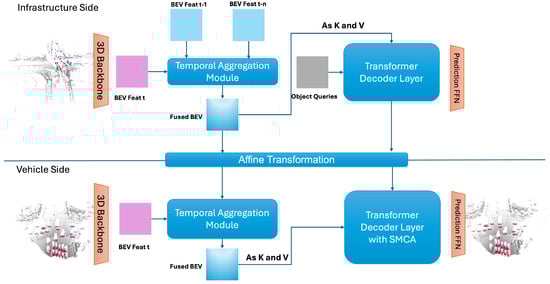 In this work, we propose a new transformer-based framework to address the problem of vehicle–infrastructure cooperative 3D object detection. As shown in Figure 2, CoFormerNet uses a fundamentally consistent architecture in both the vehicle and the infrastructure branches. The structure of each branch is similar to that of the LiDAR branch in [8]. After BEV feature extraction on the infrastructure side, we used the temporal aggregation module to fuse historical BEV features. At the same time, we fused the intermediate features of the vehicle and infrastructure sides in terms of temporal and spatial features at two stages within this process. In Section 3.1, we explain how the temporal aggregation module is used in the fusion of infrastructure-side historical BEV features and the fusion with vehicle-side BEV features. In Section 3.2, we discuss how the spatial information on both the vehicle and infrastructure sides is fused, addressing the impact on the final accuracy due to calibration bias. In Section 3.3, we briefly describe the affine transformation of infrastructure features and their processing and compression during transmission. Finally, in Section 3.4, we explain the CoFormerNet training method, including a description of the end-to-end learning framework.