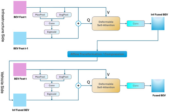 Before the fusion of the vehicle–infrastructure BEV features, due to the differences in geographical location and direction between vehicle and infrastructure sensors, the BEV feature map fused on the infrastructure side needs to be transformed into the vehicle’s coordinate system for feature fusion. Moreover, to reduce the amount of transmission, the features need to be further compressed. The specific process is explained in detail in Section 3.2. Here, we use to represent the historical fusion features of the infrastructure side of the BEV after undergoing a transformation.