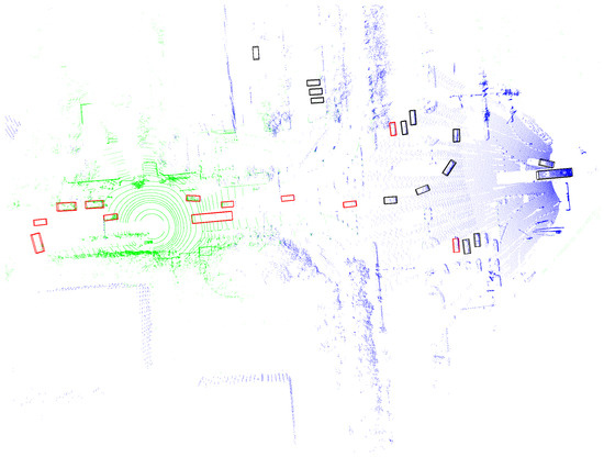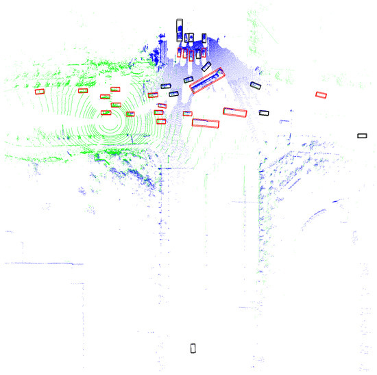 The detection results, where the blue point clouds represent data from infrastructure sensors, the green point clouds represent data from vehicle sensors, the red boxes indicate detections from individual vehicles, and the black boxes highlight additional detections obtained through sensor fusion. The fields of view of the vehicle and infrastructure sensors overlapped.